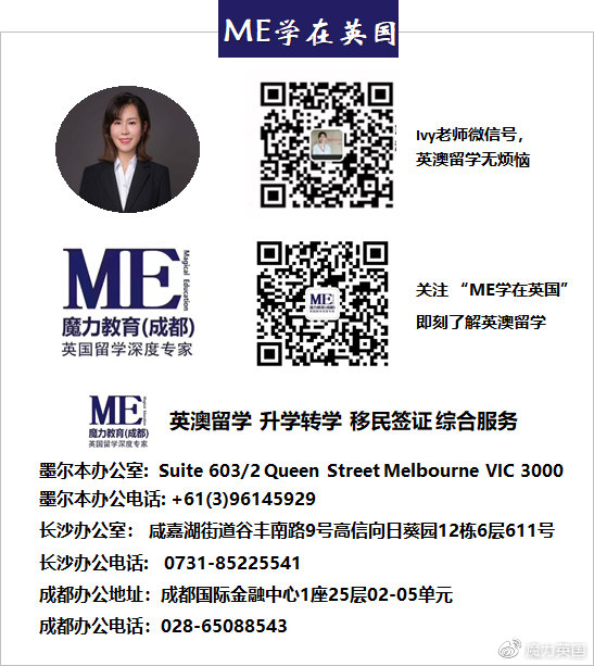 我是魔力教育Ivy老师,专注于英澳留学和移民,以真实案例分享英澳留学移民干货。如果你想了解更多的留学和移民知识,请点赞和收藏哦!有任何英澳留学问题都可以关注魔力教育官号,或者扫描下面我的咨询微信二维码提问。