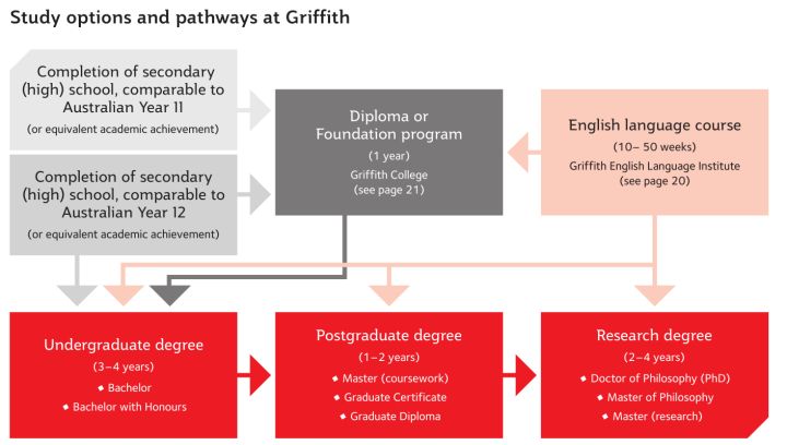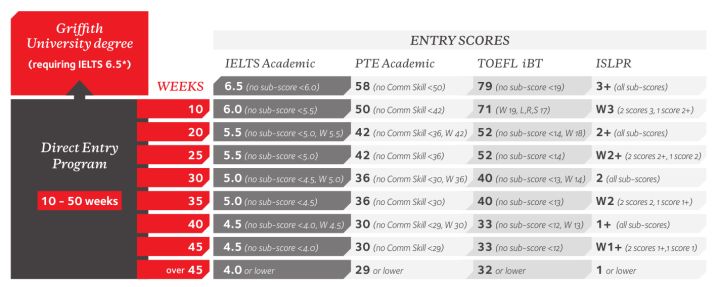 对于留学澳洲来说,不管是申请预科,本科还是研究生,如果学生的雅思成绩没有达到澳大利亚大学入学要求,学校会根据学生的雅思成绩及主课入学要求,建议澳洲留学申请人就读一定周数语言课程,然后就可以语言配套主课来澳大利亚大学入读。下面以雅思入学要求6.5为例,想要入读格里菲斯的同学可以自行对照需要上多久强化班!