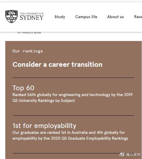 悉尼大学工程专业排名QS2020全球排名Top 60;QS 2020毕业生就业率全球Top 4, 全澳Top 1.