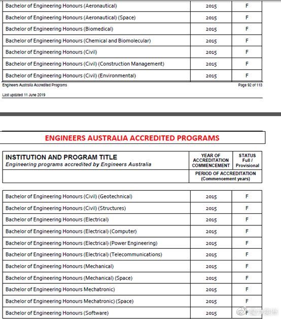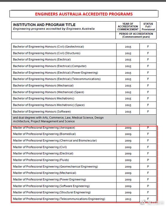 下面的截图来自澳洲EA(澳洲工程师协会截图),“F”表示完全认证,“P”表示临时认证。