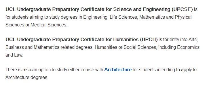 预科类型有两个大方向,科学工程类(UPCSE)和人文类(UPCH)两大类。想申请建筑相关学位课程的学生可以选择UPCSE for Architecture或者UPCH for Architecture课程来进行衔接。