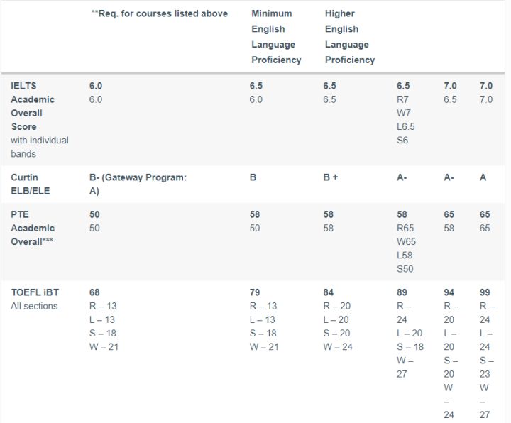 Curtin requires all applicants to demonstrate proficiency in English. Specific English requirements for this course are as outlined in the IELTS table below. Additional information on how you can meet the English requirement can be found on the English proficiency page.