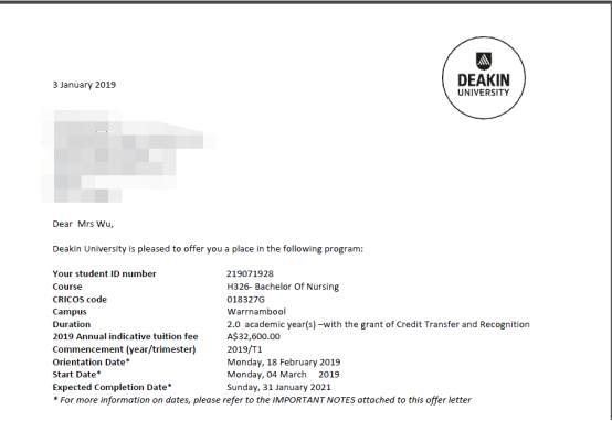 W同学, 大专护理毕业,并且通过专升本,拿到了护理本科毕业证,学位证,有护士大小证,有8年工作经验,拿到了迪肯大学Warrnambool 校区2年的Bachelor of Nursing unconditional offer。 W同学,PTE达到四个65以上,顺利拿到迪肯大学Warrnambool 校区奖学金。