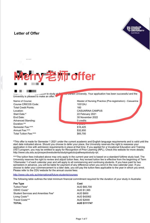 X 同学,国内某双非大学,会计专业,成功拿到达尔文大学的护士硕士offer.